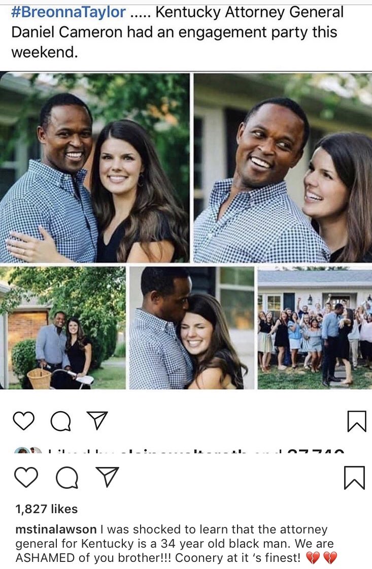 Kentucky attorney general engagement party. Tina Lawson took to Instagram to express her discontent calling the fact that the man who has yet to arrest the officers is a 34-year-old Black man coonery at its finest. He spoke at the 2020 Republican National Convention on August 24 2020. Kentuckys Attorney General Daniel Cameron has continued to make headlines as his office is investigating the death of Breonna Taylor a 26-year-old Black woman who was shot by.