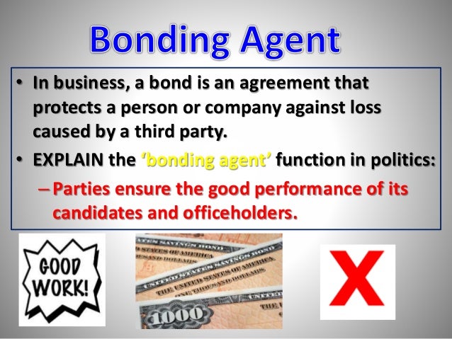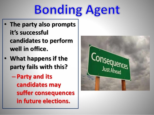 Which is an example of a party acting as a bonding agent. Party officials decide if a candidate is qualified and of good character.